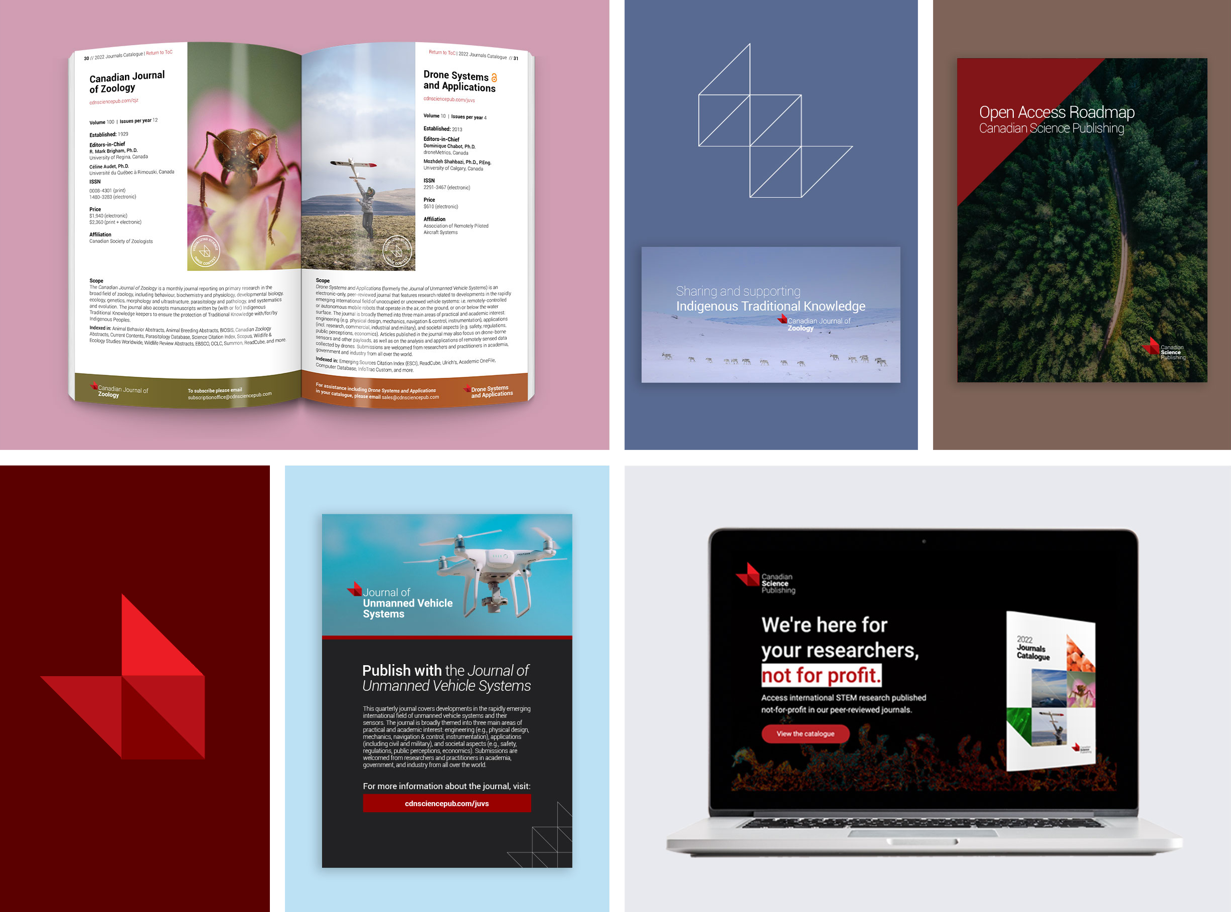 Top left: Inner spread example of the sales catalogue layout. Top center: Social Media Promotional Graphic. Top right: Cover for CSP's Open Access Roadmap. Bottom center: Call for Papers template design. Bottom right: Journal Catalogue landing page.